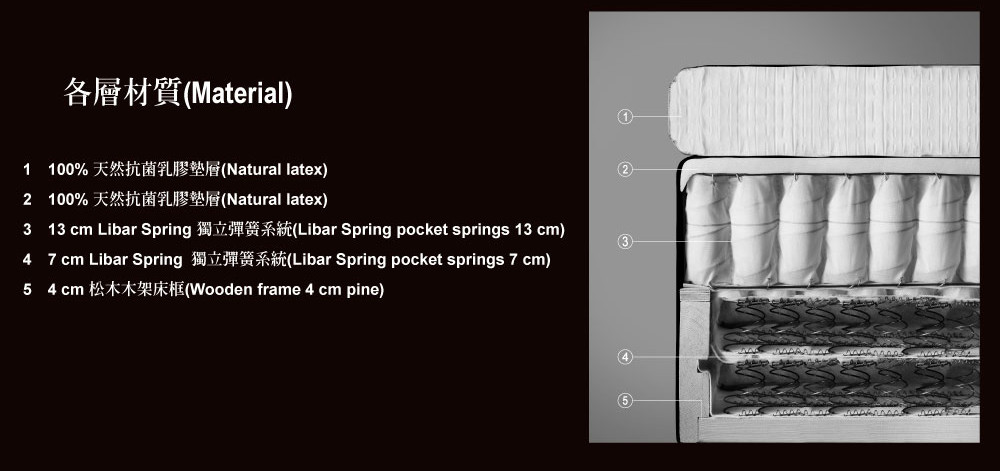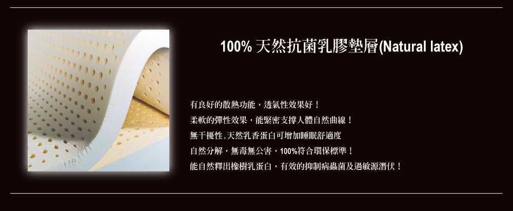 ◎100%天然抗菌乳膠墊層,有良好的散熱功能,透氣性效果好。柔軟的彈性效果,能緊密支撐人體自然曲線。